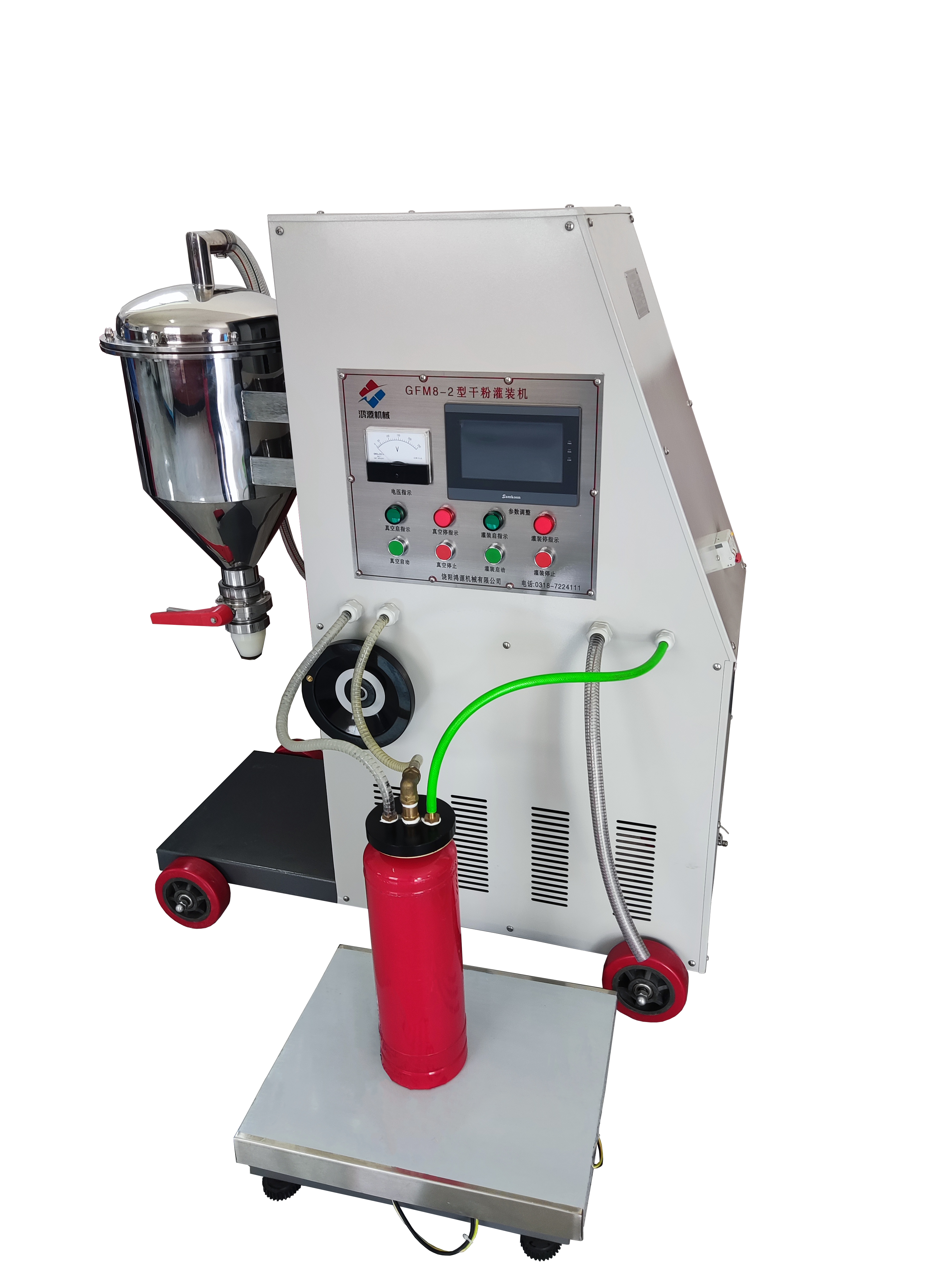 GFM型干粉灌装机是我厂参照国内外粉类灌装机的优点结合实际灌装的特点,开发设计的新产品采用了真空射流技术,将干粉快速吸入被装筒体,配备高精度的T3806型称重显示仪及MP-T型打印机。使其灌装具备了自动化计量化同时利用真空所产生的负压对过滤器上的残余粉尘进行清除。本机集电子电器机械于一体,从而减轻了劳动强度改善了工作环境具有体积小、重量轻、能耗低、移动方便、操作简单、使用寿命长等特点,特别适用于干粉灭火器的粉灌装,也是其它粉类灌装行业的理想设备。